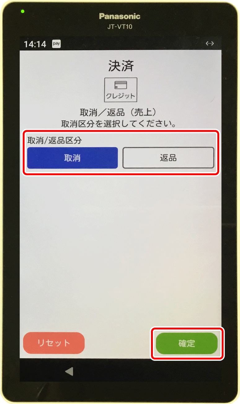 取消区分を選択し、【確定】をタップします。※この取消区分はJT-VT10での処理に使用するものであり、スマレジの取消情報には反映されません -