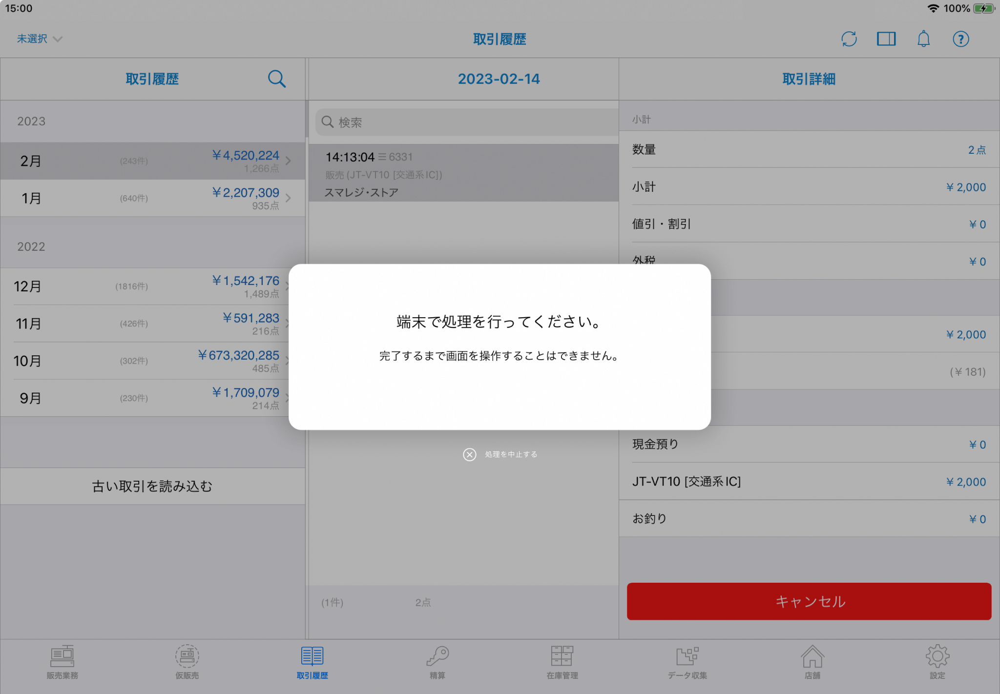 スマレジ・アプリと決済端末『JT-VT10』と連携して使用している場合、決済の取り消し操作も連携可能です。