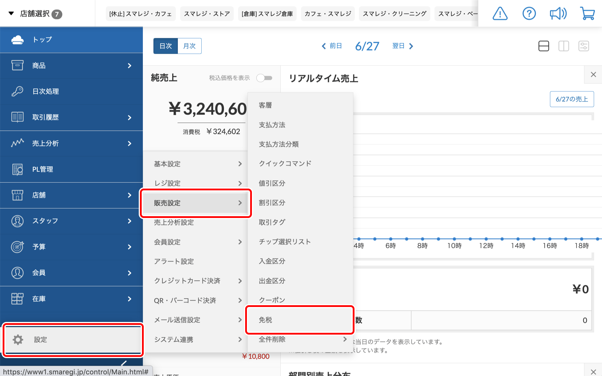 スマレジ管理画面で『設定 > 販売設定 > 免税』と選択し、免税設定の画面を表示します。