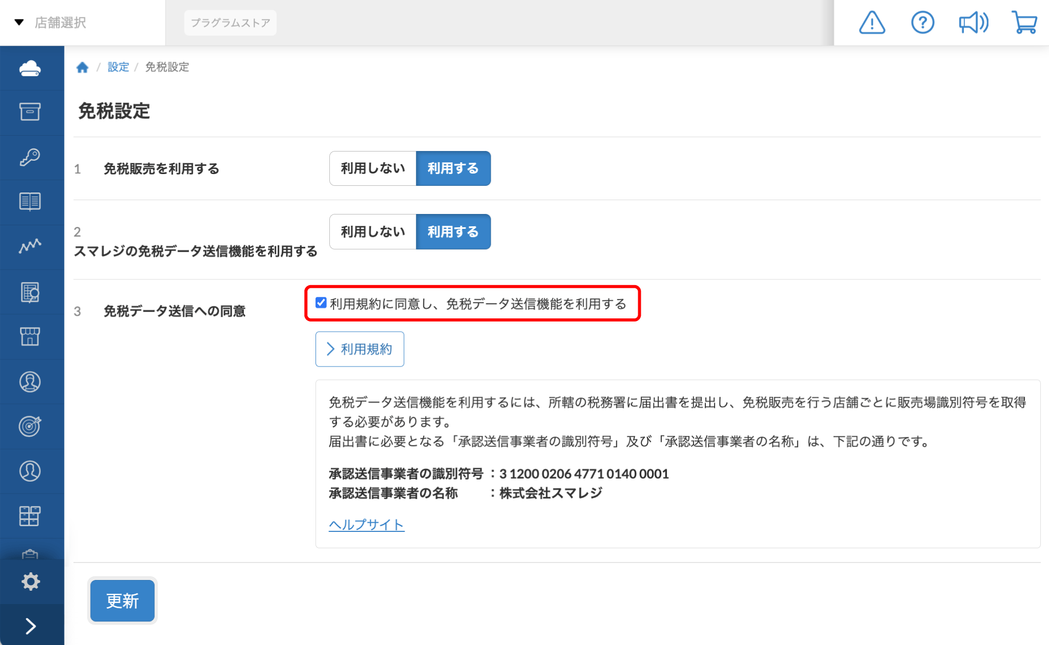 『免税販売を利用する』を【利用する】になっていることを確認し、【更新】をクリックします。