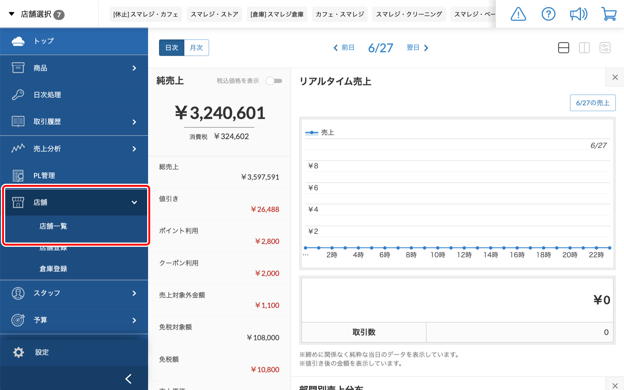 スマレジ管理画面で『店舗 > 店舗一覧』と選択し、店舗一覧画面を表示します。