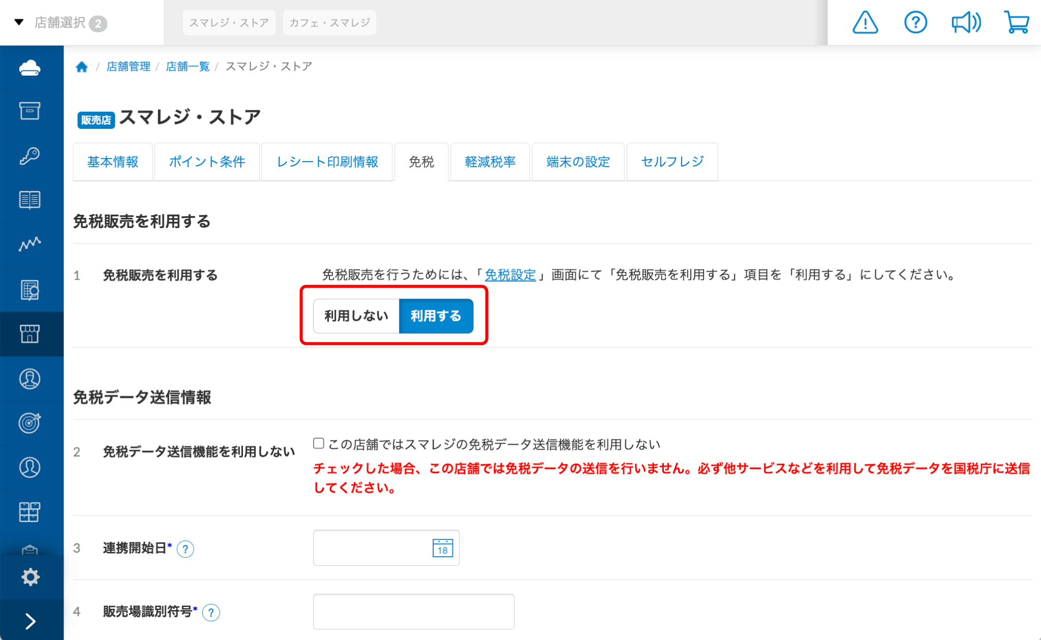 『免税販売を利用する』が【利用する】の上、『利用規約に同意し、免税データ送信機能を利用する』にチェックが入っていることを確認します。以上で『免税設定』の対応は完了です。 -