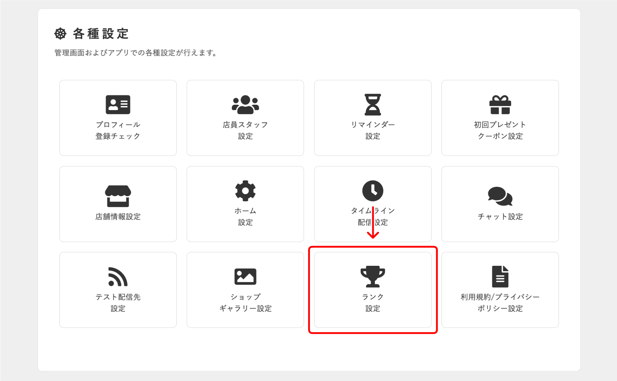 各種設定画面で【ランク設定】をクリックします。