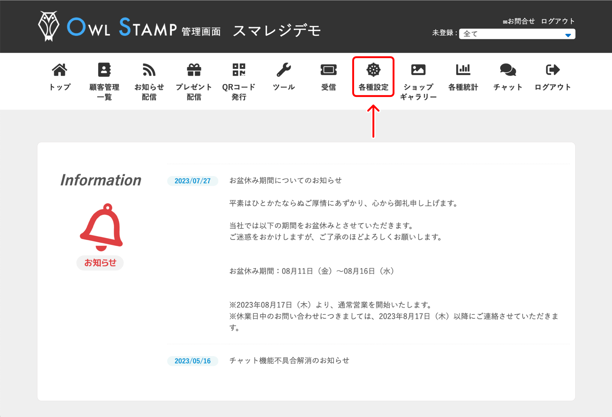 スマレジ・Shopアプリ管理画面で【各種設定】をクリックします。