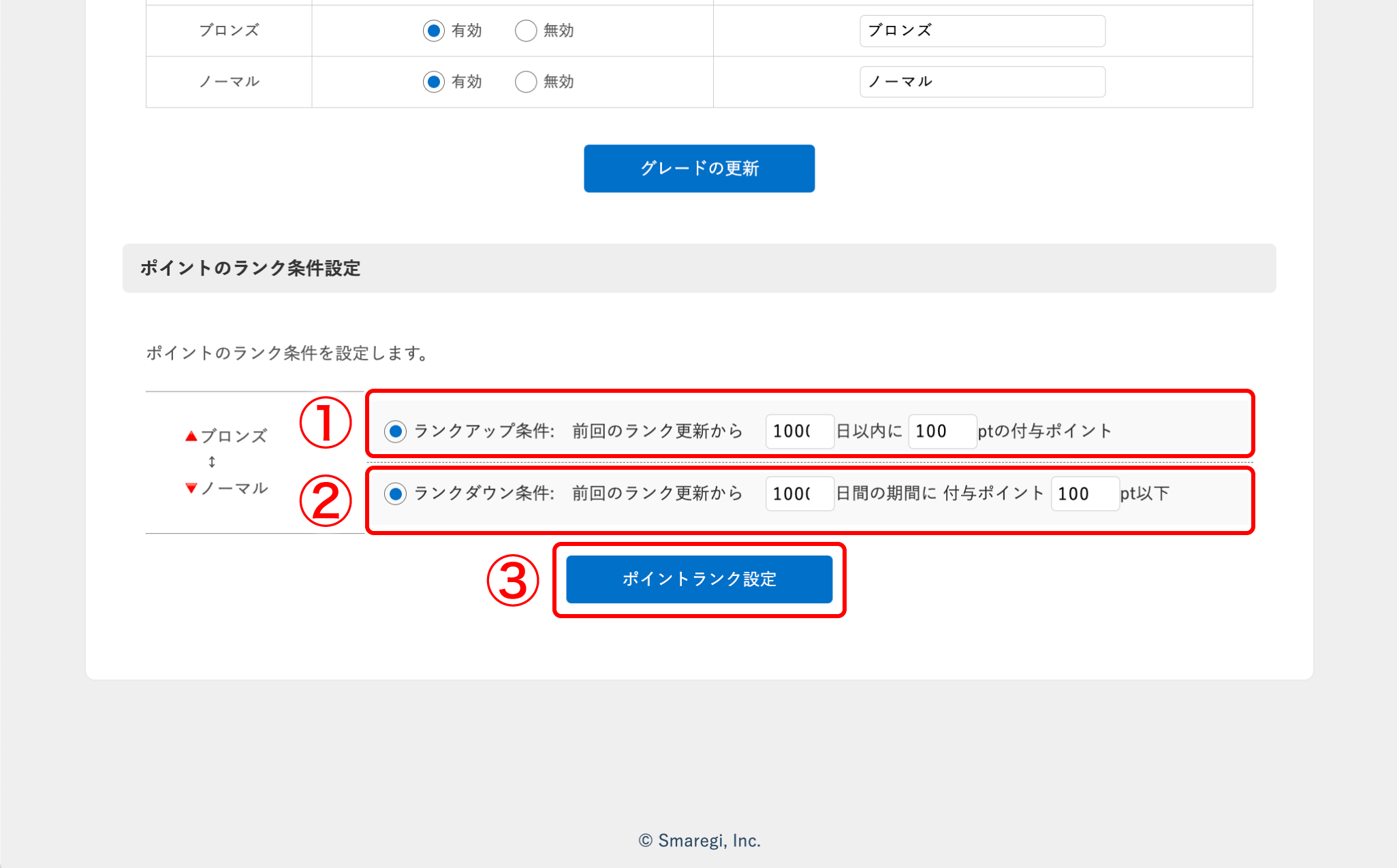 前回のランク更新からの日数と、ランクアップに必要な付与ポイント数を設定できます。