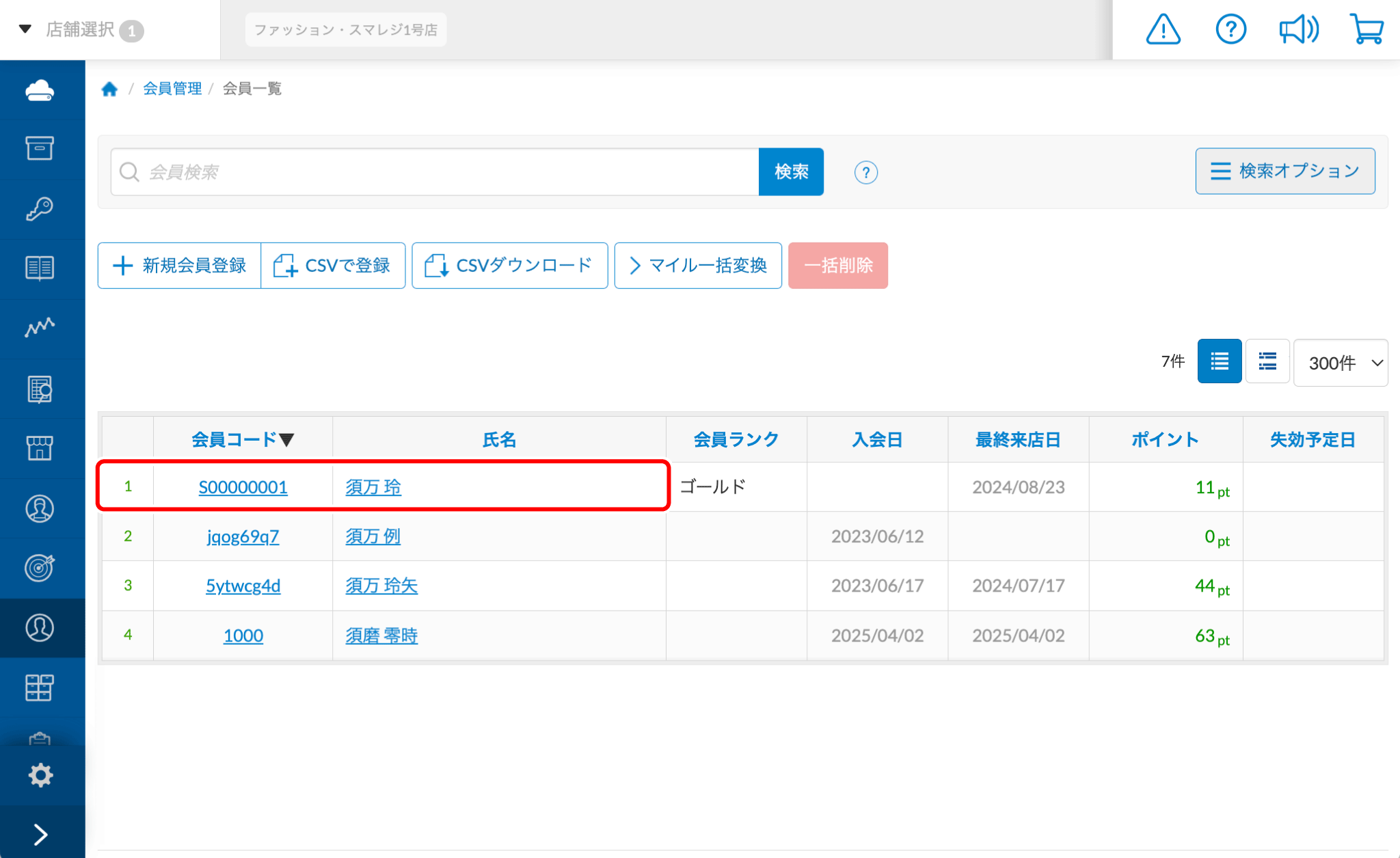 空欄で【検索】をクリックすると、会員情報が表示されます。