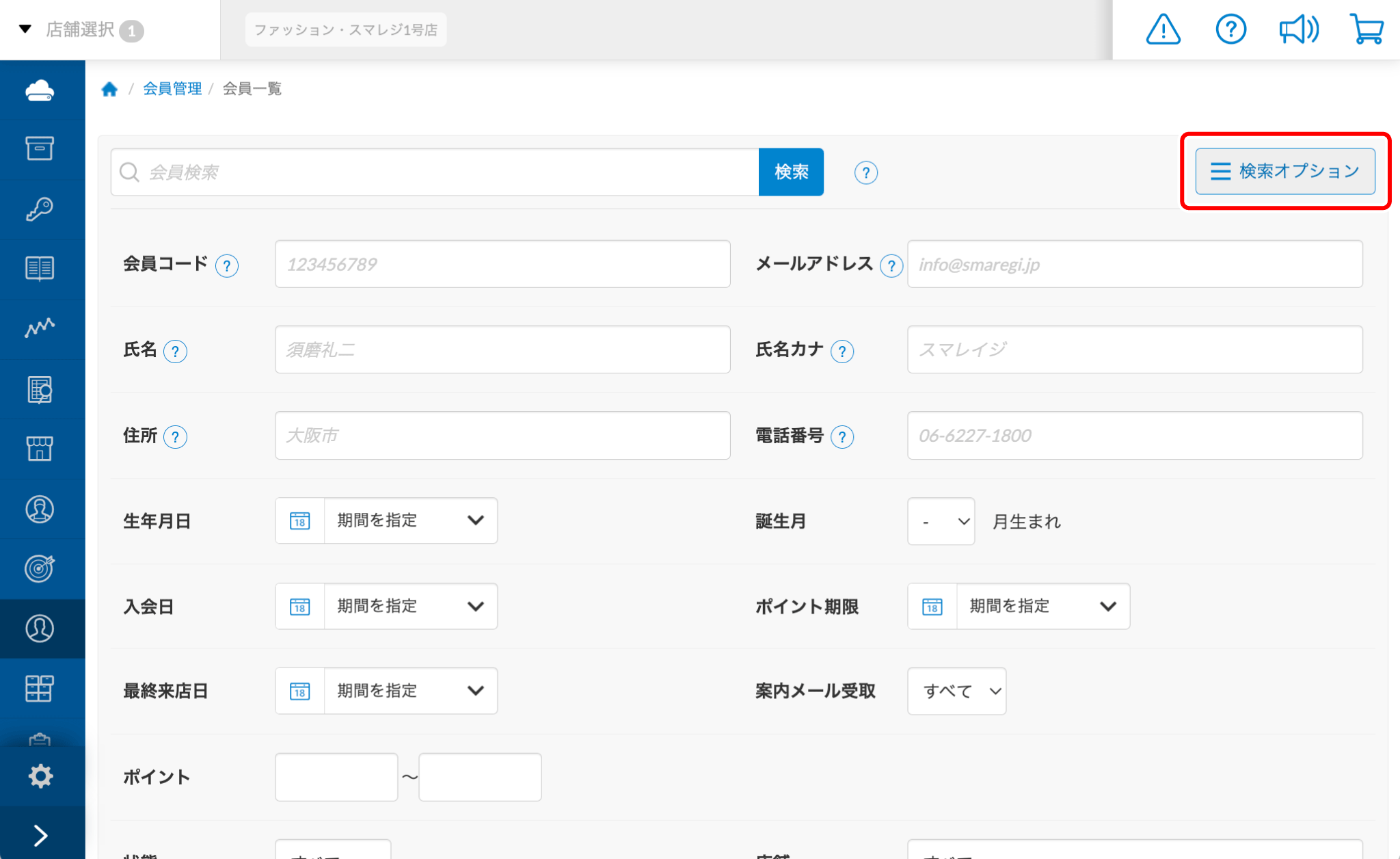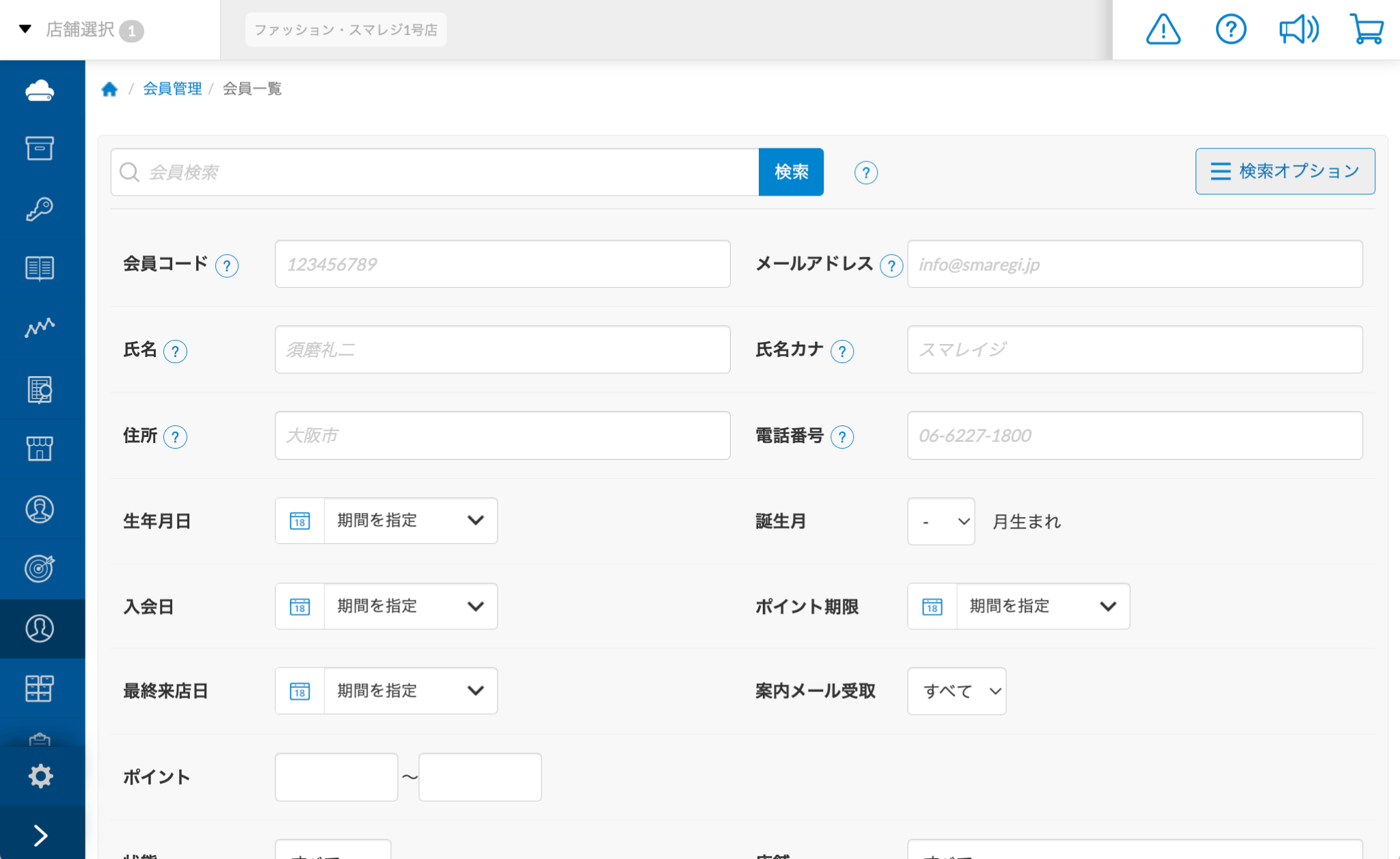 FAX番号・携帯番号も同時に検索します。生年月日 生年月日で検索します。 誕生月 『生年月日』の『月』で検索できます。 入会日 入会日で検索できます。 ポイント期限 ポイント期限(失効予定日)で検索できます。 最終来店日 最終来店日で検索できます。 案内メール受取 案内メール受取が【許可】か【拒否】で検索できます。 ポイント ポイント残高で検索できます。 状態 状態で検索できます。 店舗 店舗で検索できます。 会員ランク 会員ランクで検索できます。