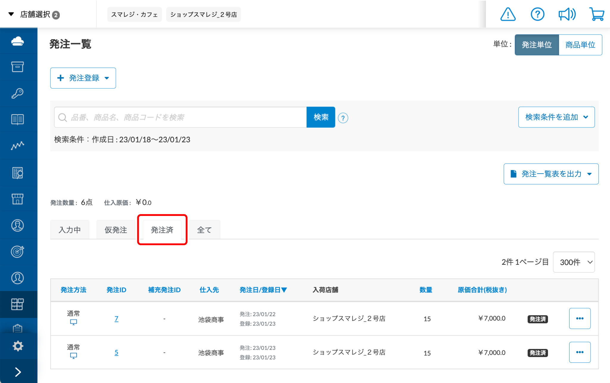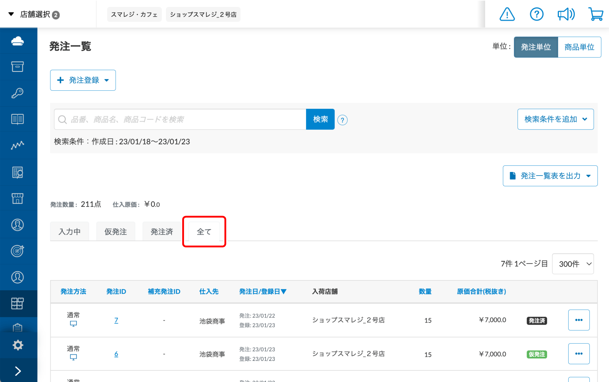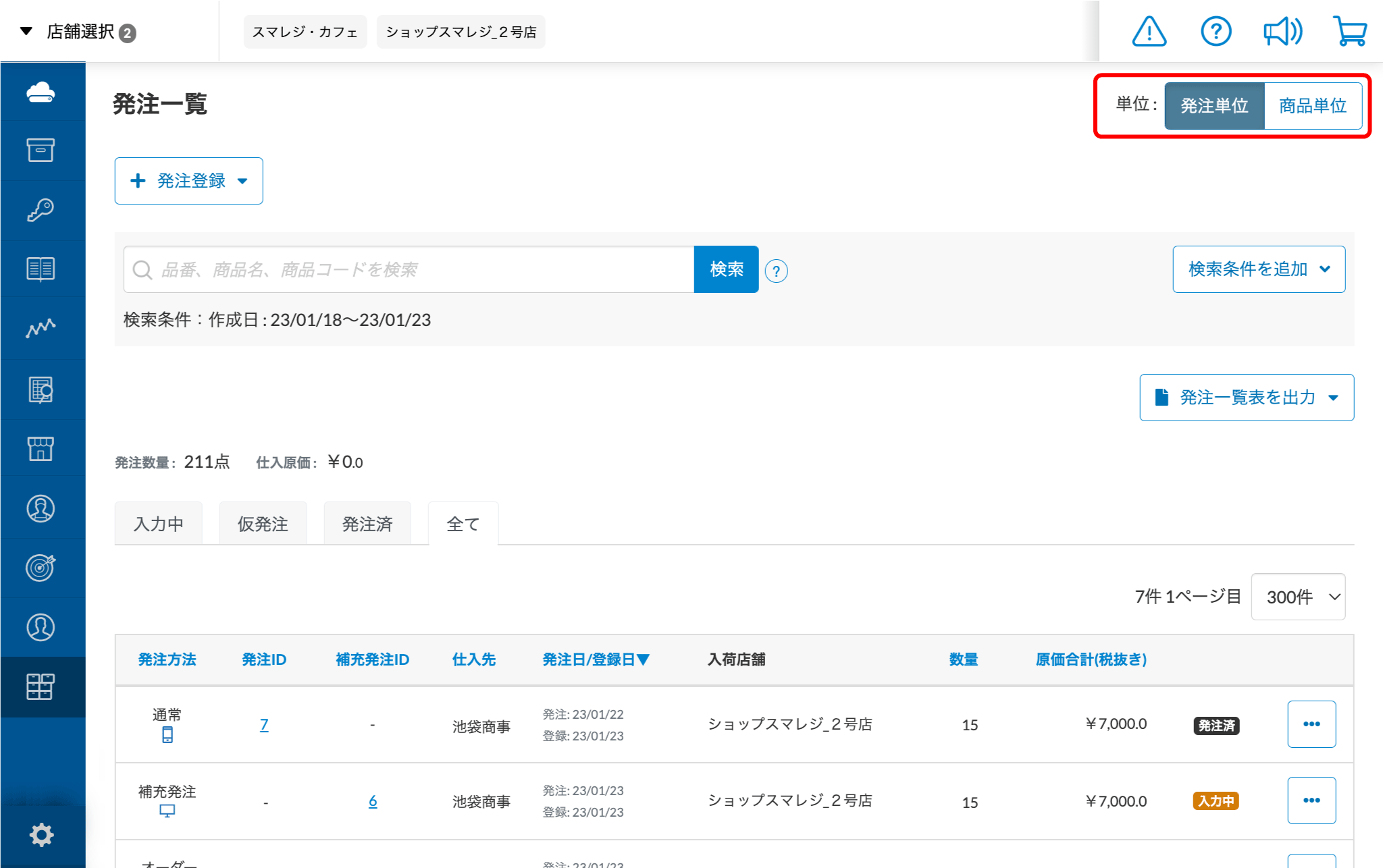 すべての発注情報と補充発注情報の一覧が表示されます。※検索条件で『登録日』の指定が必要です