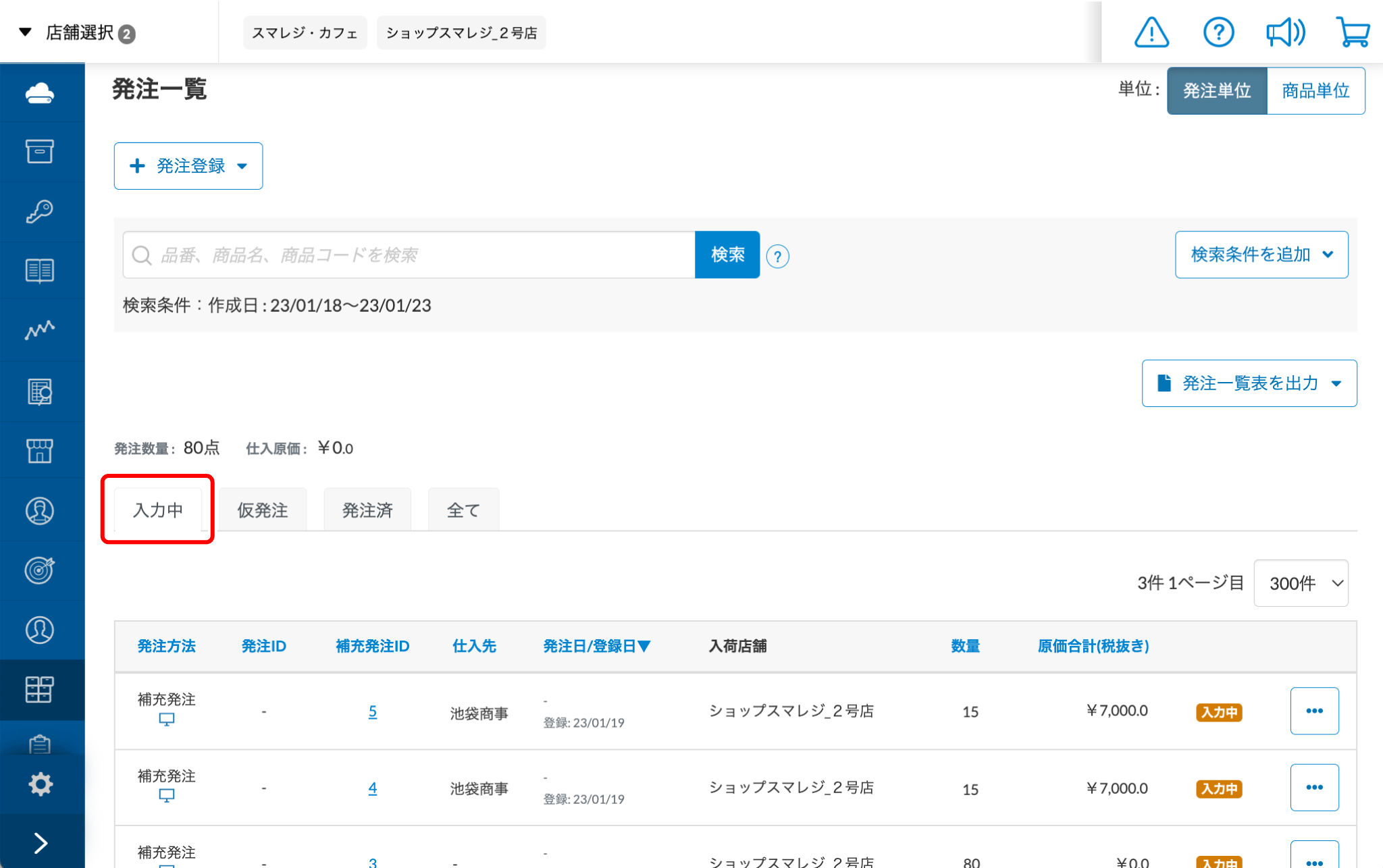 『入力中』の発注情報を仮発注に変更することもできます。 -