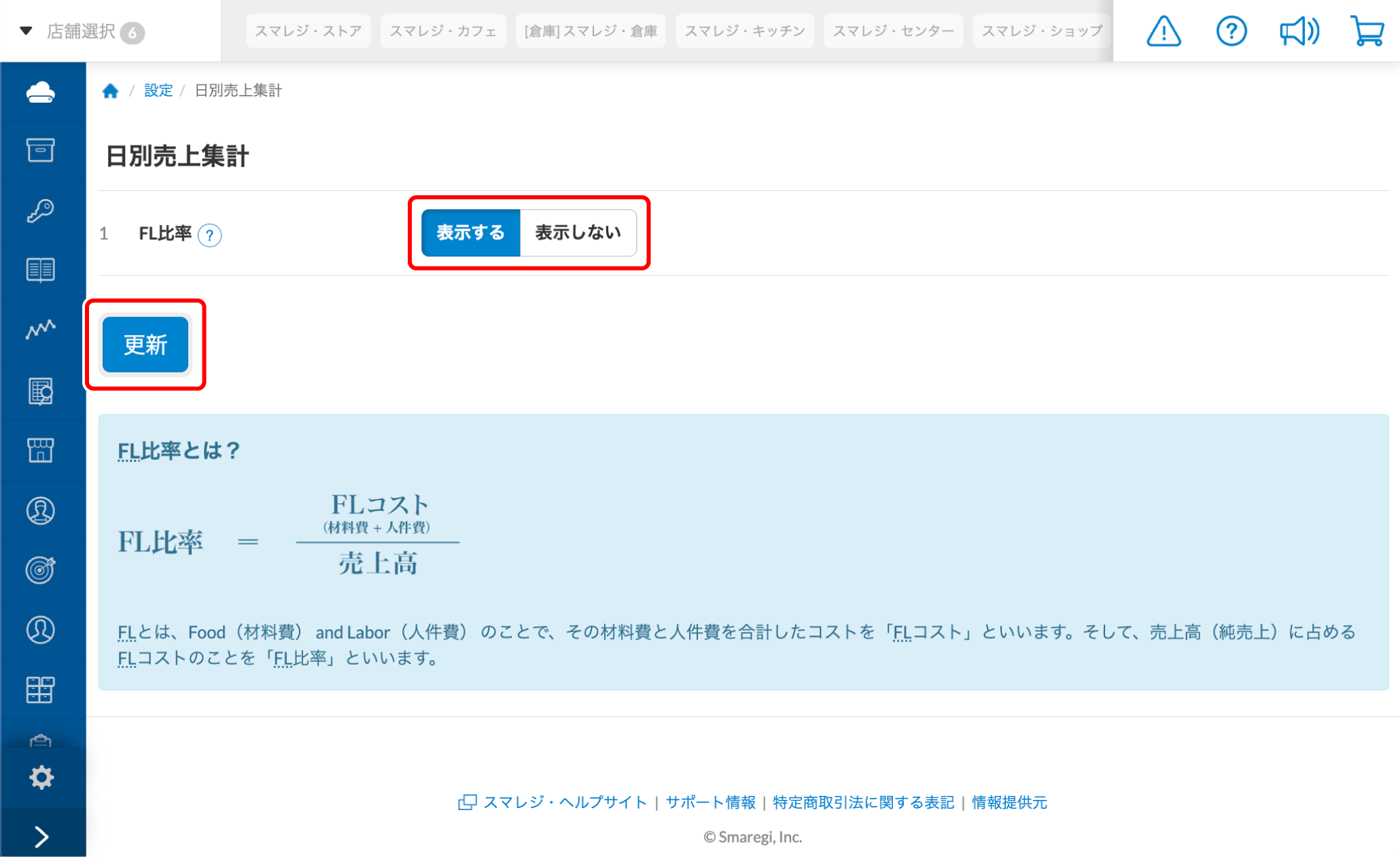 FL比率は日別売上集計と店舗別売上集計で確認することができます。