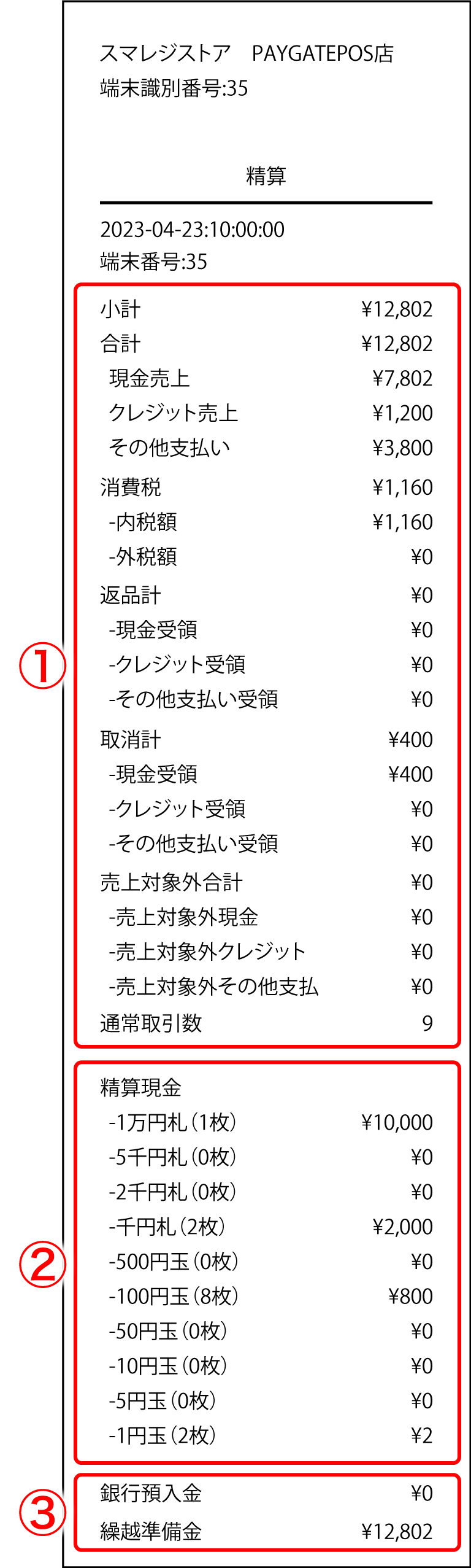 [小計] [合計] [消費税] [返品計] [取消計] [売上対象外合計] [通常取引数]
