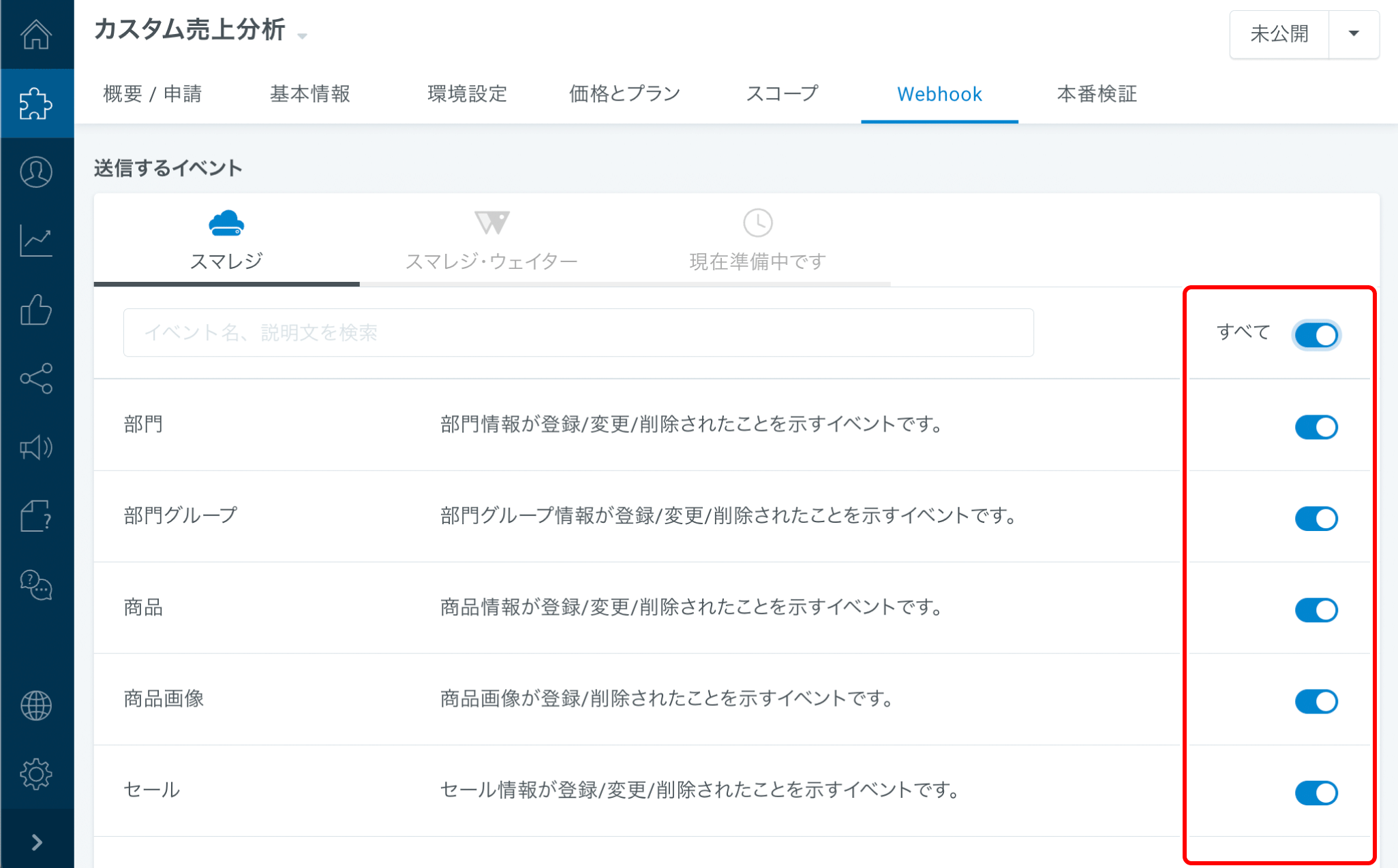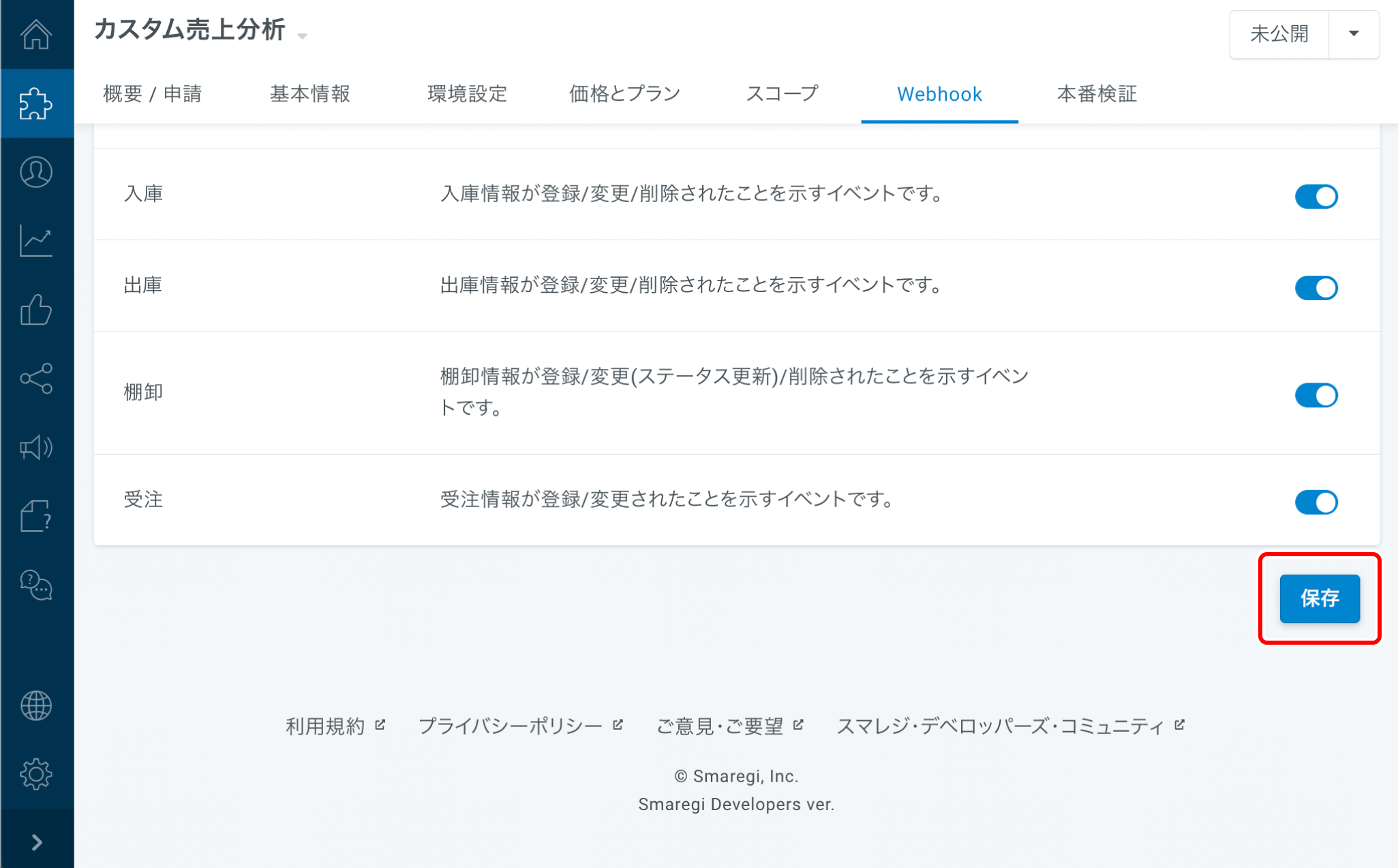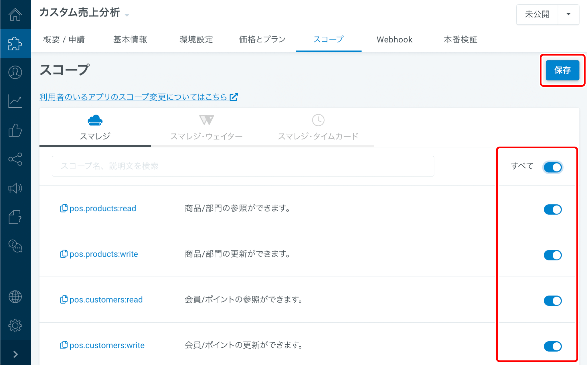スマレジAPIの受信設定(参照APIと更新API)と同じ項目をONにします。