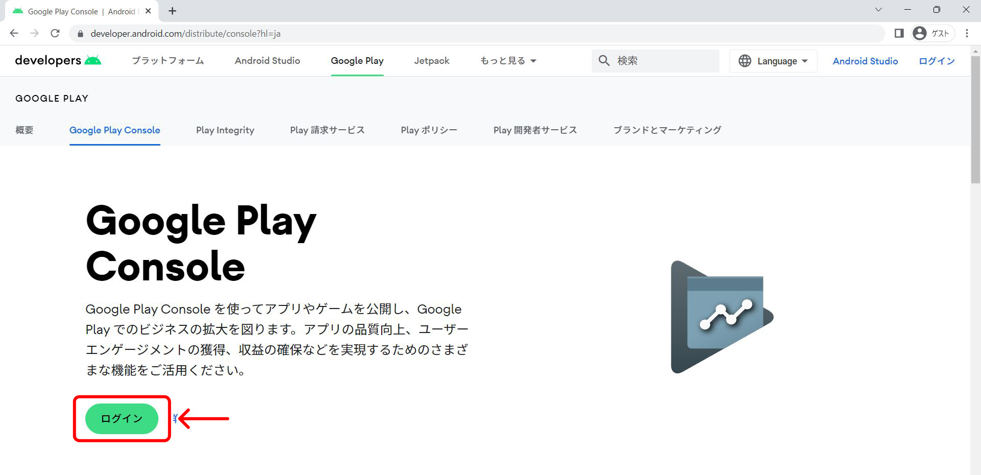 『Google Play Console』を表示し、【ログイン】をクリックしてください。