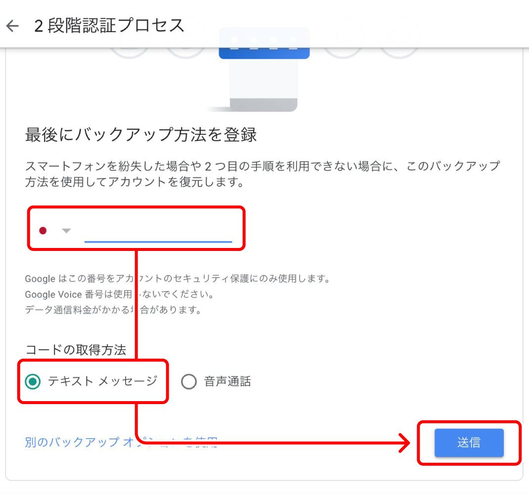 『お客様ご自身の携帯電話番号』を入力し、コードの取得方法『テキスト メッセージ』を選択して【送信】をクリックしてください。入力した電話番号宛に『確認コード』が届きます。