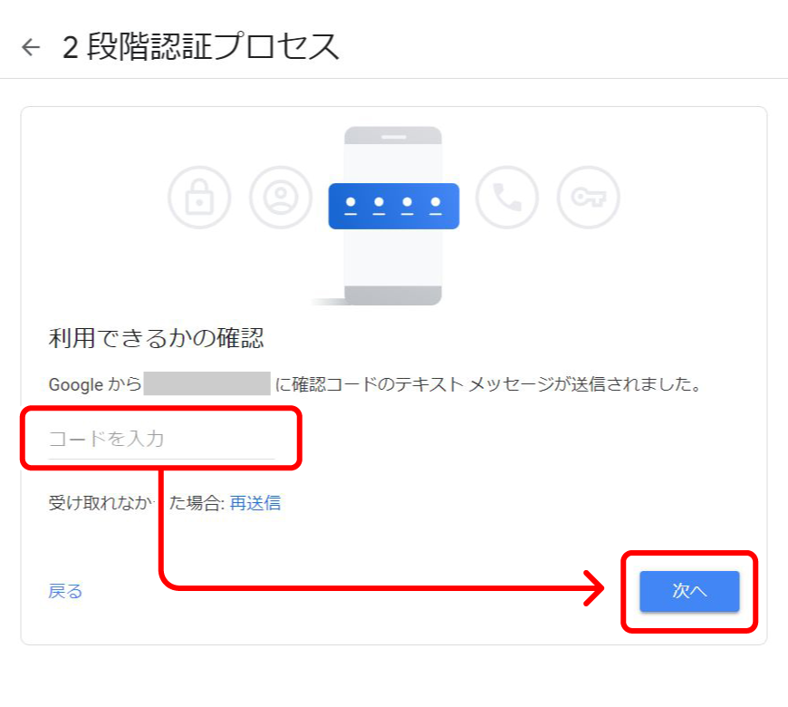 届いた確認コードを入力し【次へ】をクリックしてください。2段階認証プロセスを有効にするか確認する画面が表示されます。