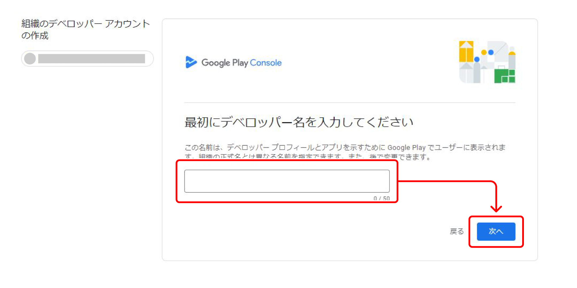 『最初にデベロッパー名を入力してください』画面でストア上で表示されるデベロッパー名を入力し、【次へ】をクリックします。