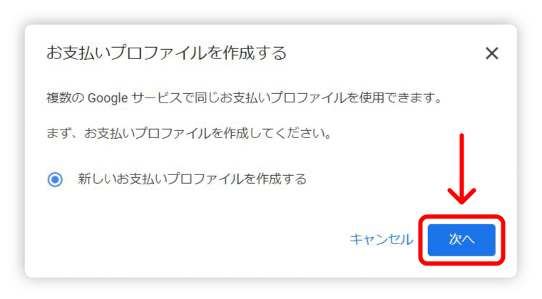 『新しいお支払いプロファイルを作成する』にチェックを入れ、【次へ】をクリックします。