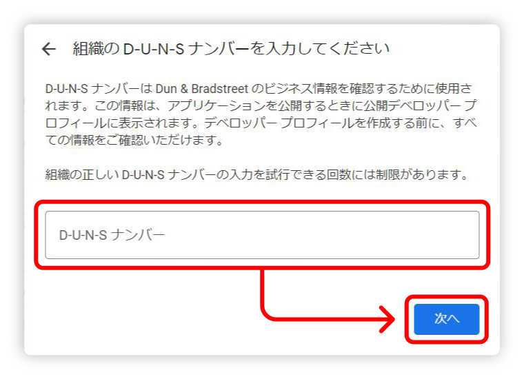 お客様の正確な『D-U-N-S ナンバー』を入力し、【次へ】をクリックします。※ D-U-N-S ナンバーにつきましては、お客様にてご確認をお願いいたします【D-U-N-S ナンバー】詳細は、以下の東京商工リサーチ webサイトよりご確認ください。D-U-N-S® Number(ダンズナンバー):https://www.tsr-net.co.jp/service/detail/get-a-duns-number.html※ 未取得の場合、上記サイトより取得してください※ お客様の『D-U-N-S ナンバー』所持状況や番号については弊社では確認できません