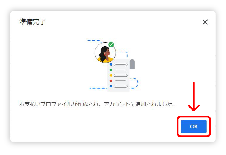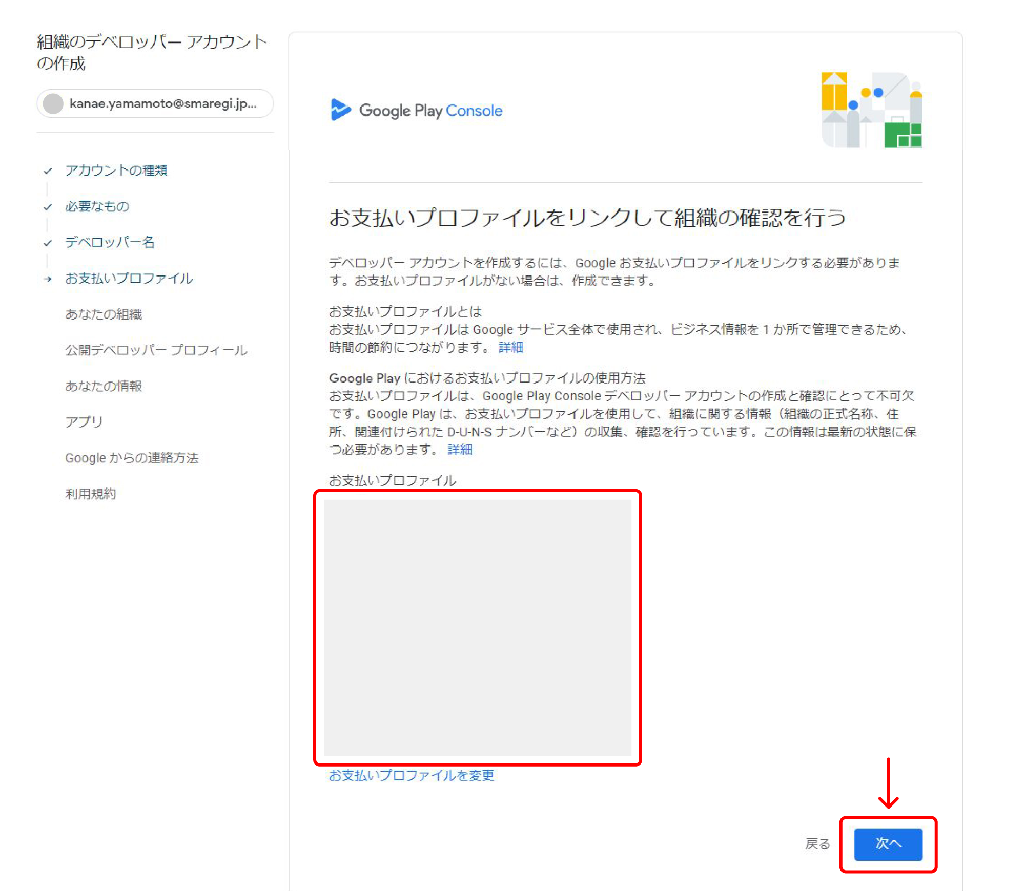 『お支払いプロファイルをリンクして組織の確認を行う』画面に戻り、お支払いプロファイルが表示されます。