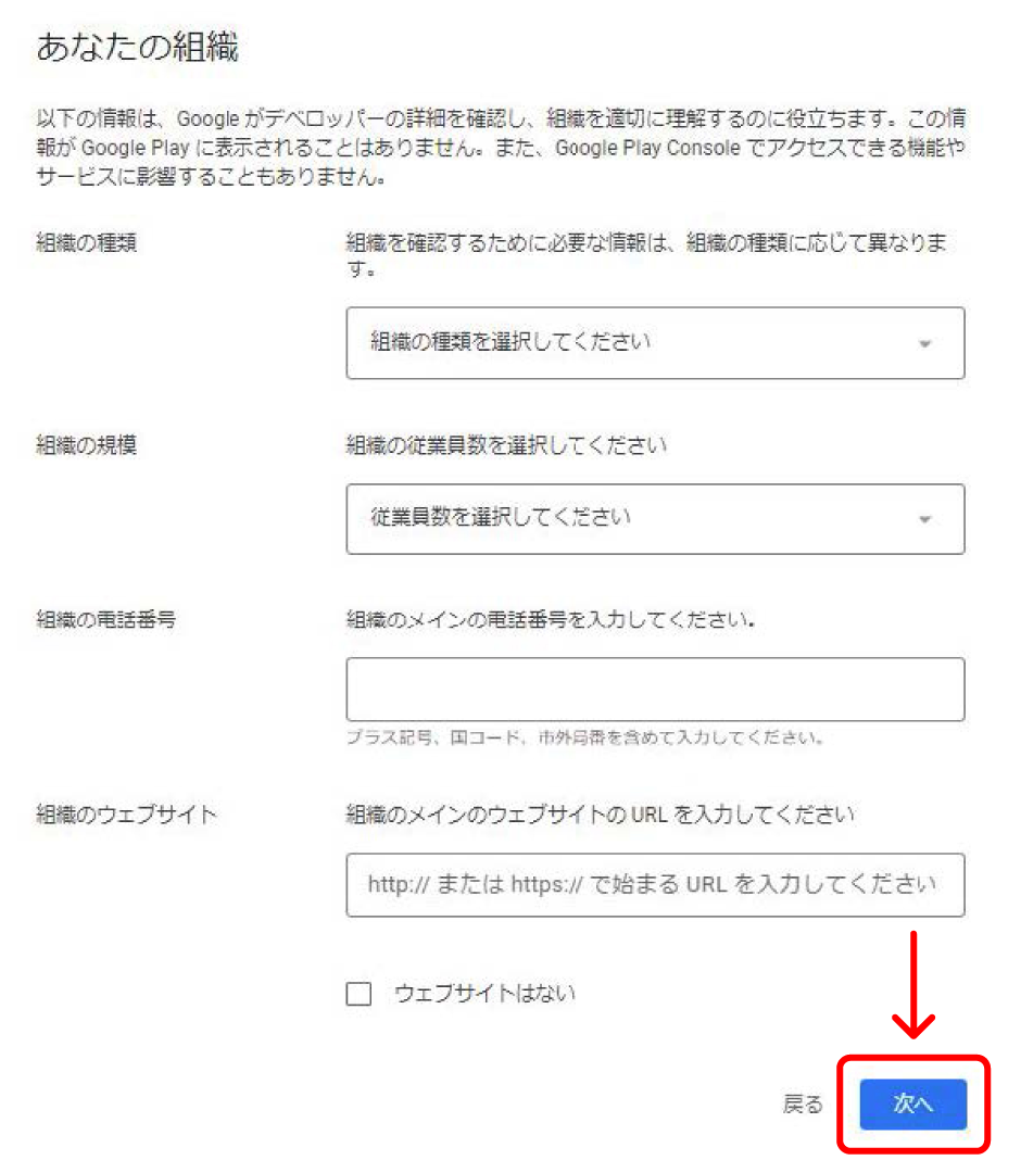組織の種類 組織の種類を選択します。 ※ 『企業』または『ビジネス』で問題ありません組織の規模 従業員数を選択します。 ※ 大体の人数で問題ありません組織の電話番号 電話番号を入力します。(先頭の『0』を『+81』に変更して入力します) ※ 03-1234-5678の場合『+81312345678』になります※ ハイフンは不要です組織のウェブサイト 会社や店舗のwebサイトURLを入力します。 ※ webサイトのご利用がない場合は下の『ウェブサイトはない』にチェックをいれてください入力が完了したら【次へ】をクリックします。