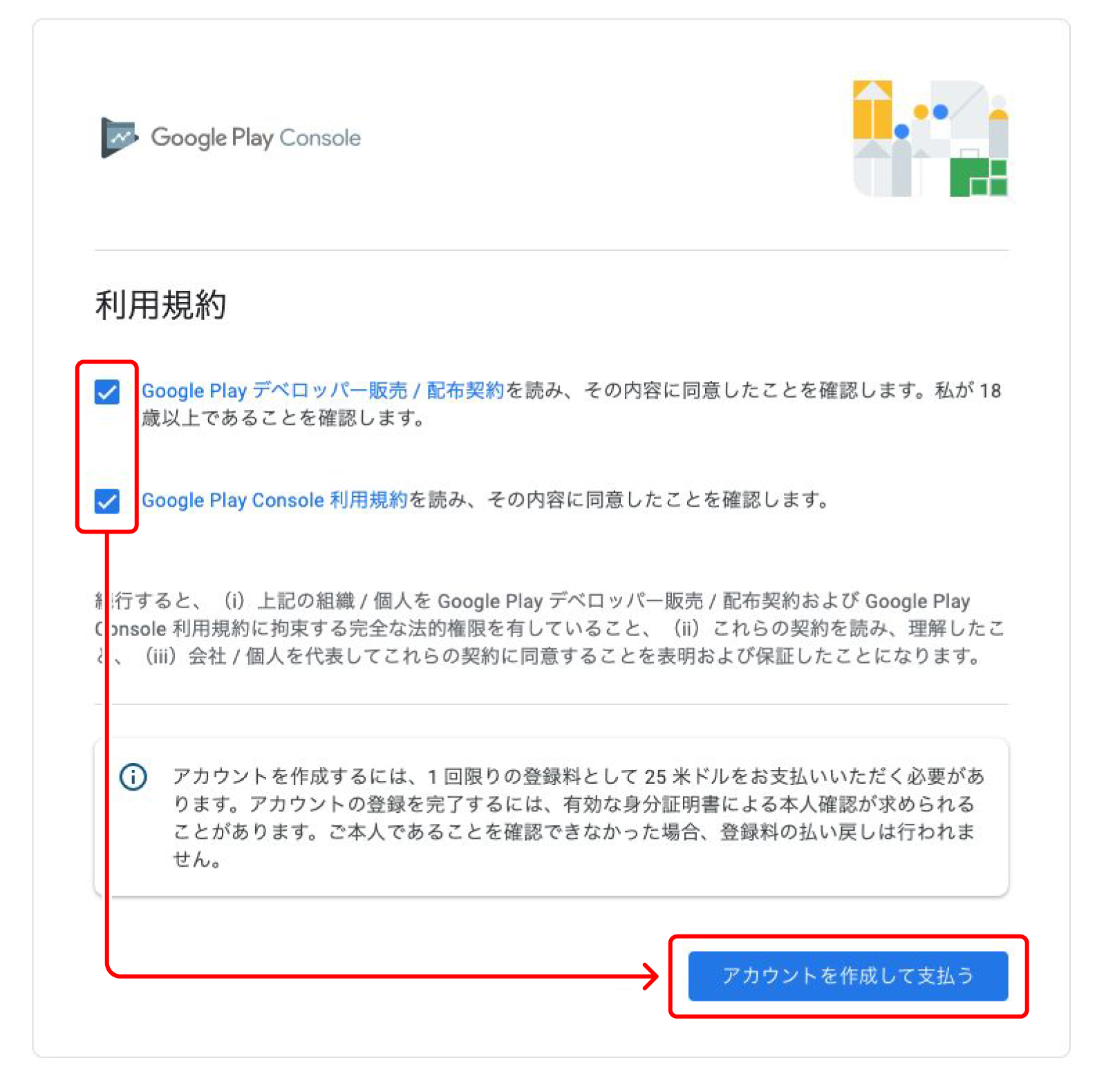 『Google Play デベロッパー販売 / 配布契約』と『Google Play Console 利用規約』をご確認いただき、それぞれの項目にチェックを入れてください。