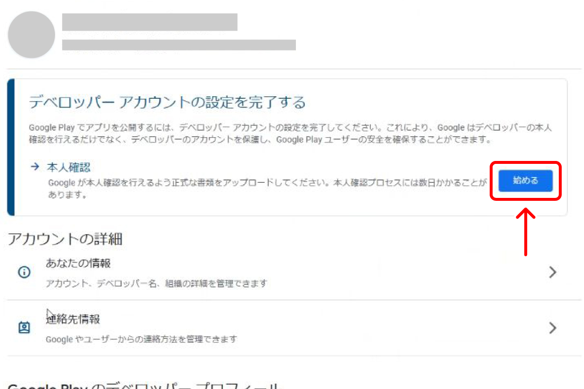 『デベロッパーアカウントの設定を完了する』と表示されますので、本人確認項目から【始める】をクリックします。