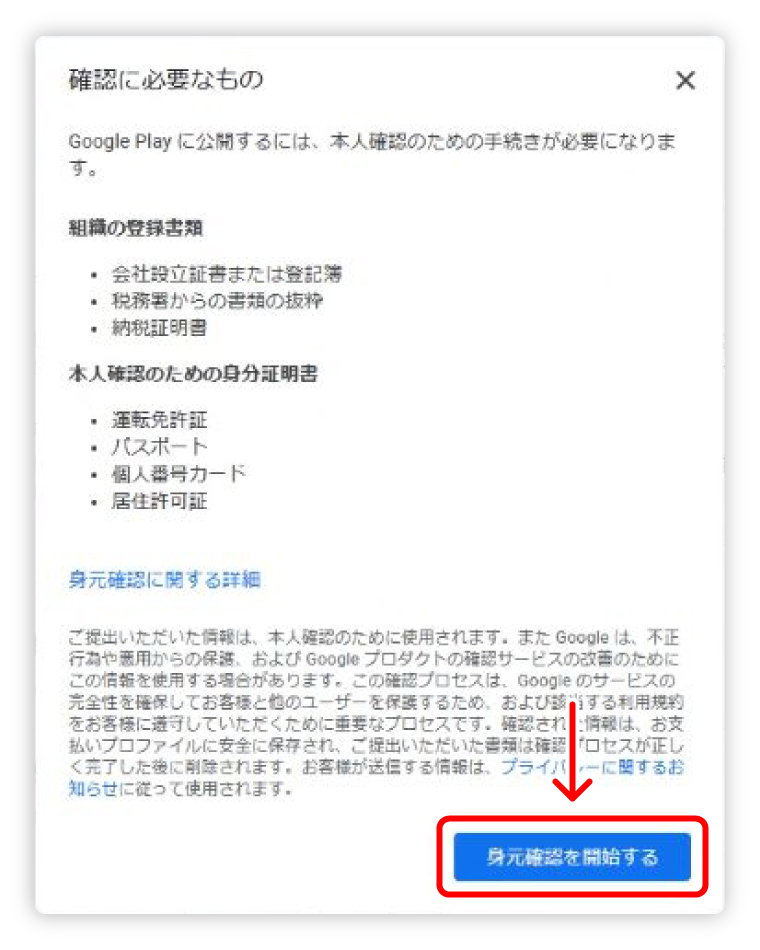 組織の登録書類 ・ 会社設立書または登記簿・ 納税書からの書類の抜粋・ 納税証明書本人確認のための身分証明書 ・ 運転免許証・ パスポート・ 個人番号カード・ 居住許可証確認書類の用意ができましたら【身元確認を開始する】をクリックします。