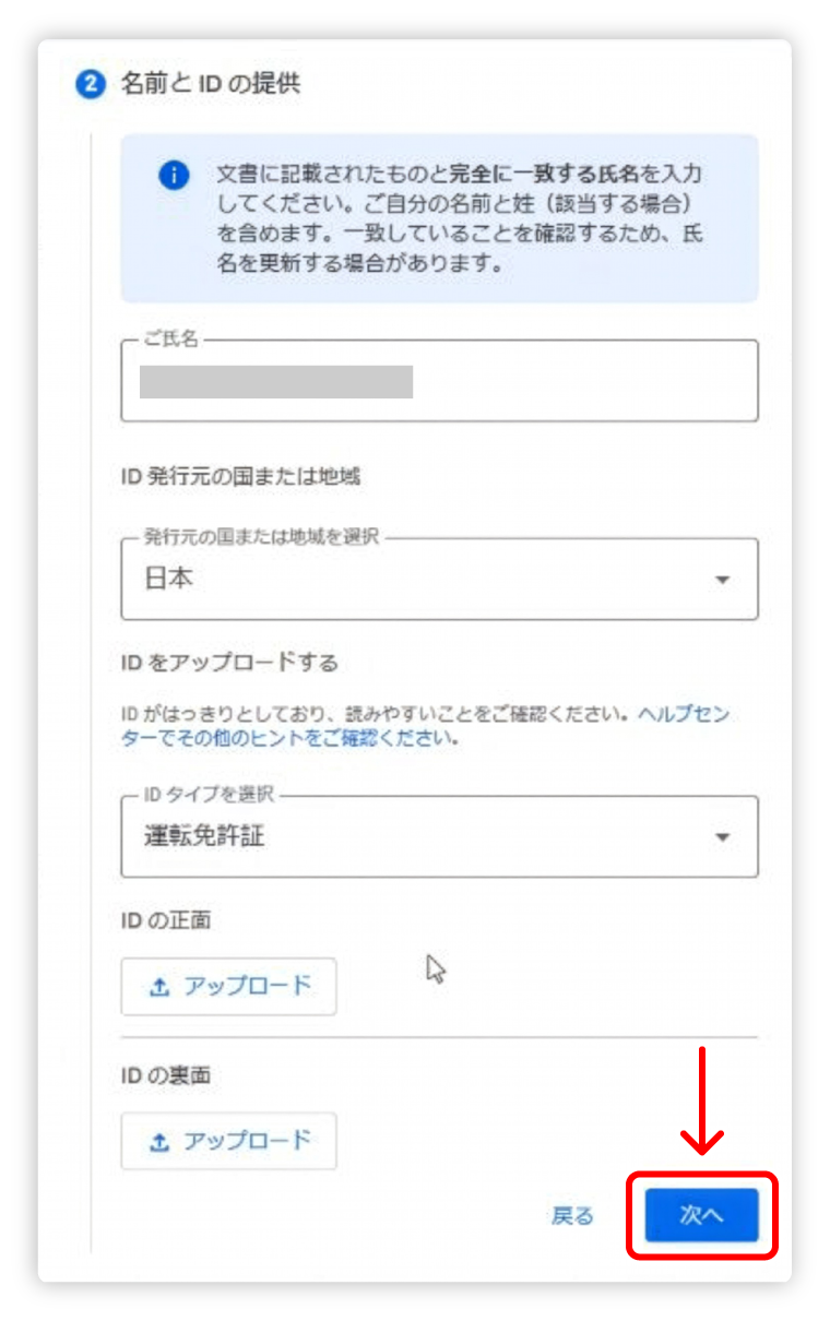 ご氏名 担当者氏名を入力します。 ID発行元の国または地域 本人確認に使用する書類の発行元を選択します。 IDをアップロードする アップロードする書類の種類を選択し、ご用意いただいた『本人確認のための身分証明書』をアップロードして提出します。 アップロードが完了したら、【次へ】をクリックします。