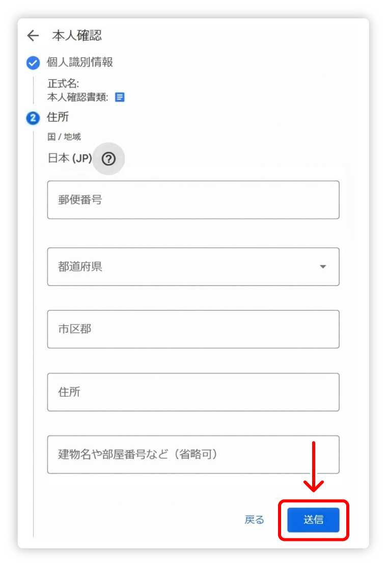 アップロードした本人確認のための身分証明書に記載されている住所を正確に入力してください。