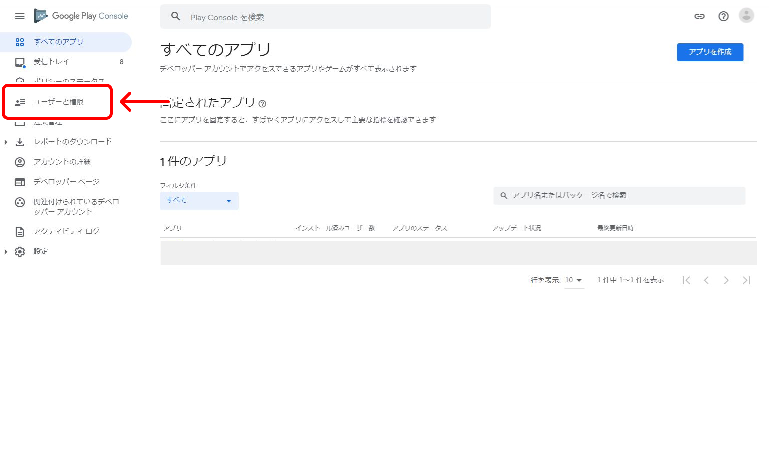 https://developer.android.com/distribute/console左側のメニューから『ユーザーと権限』をクリックします。
