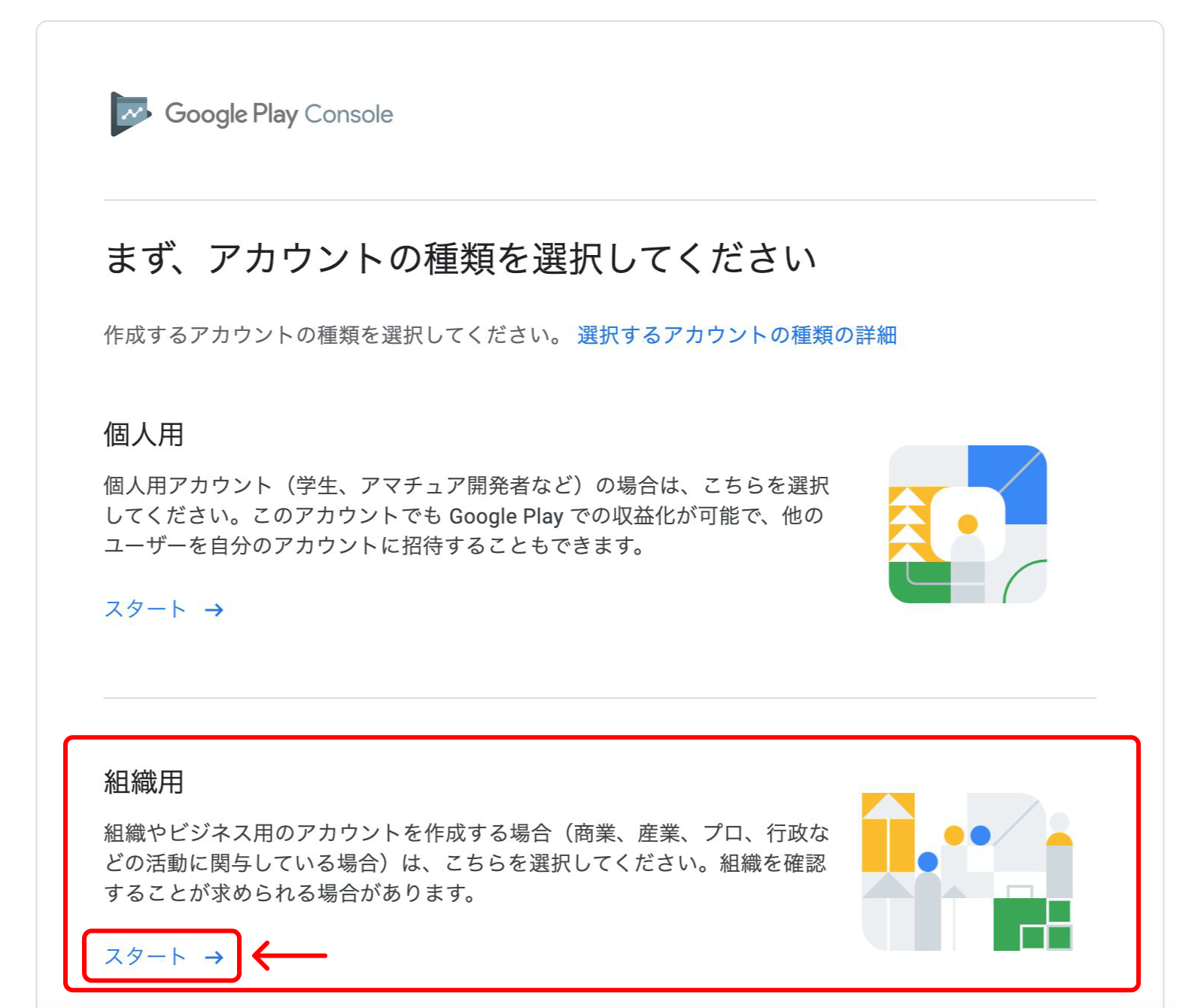 アカウントの種類で『組織用』の【スタート】(または【始める】)を選択します。