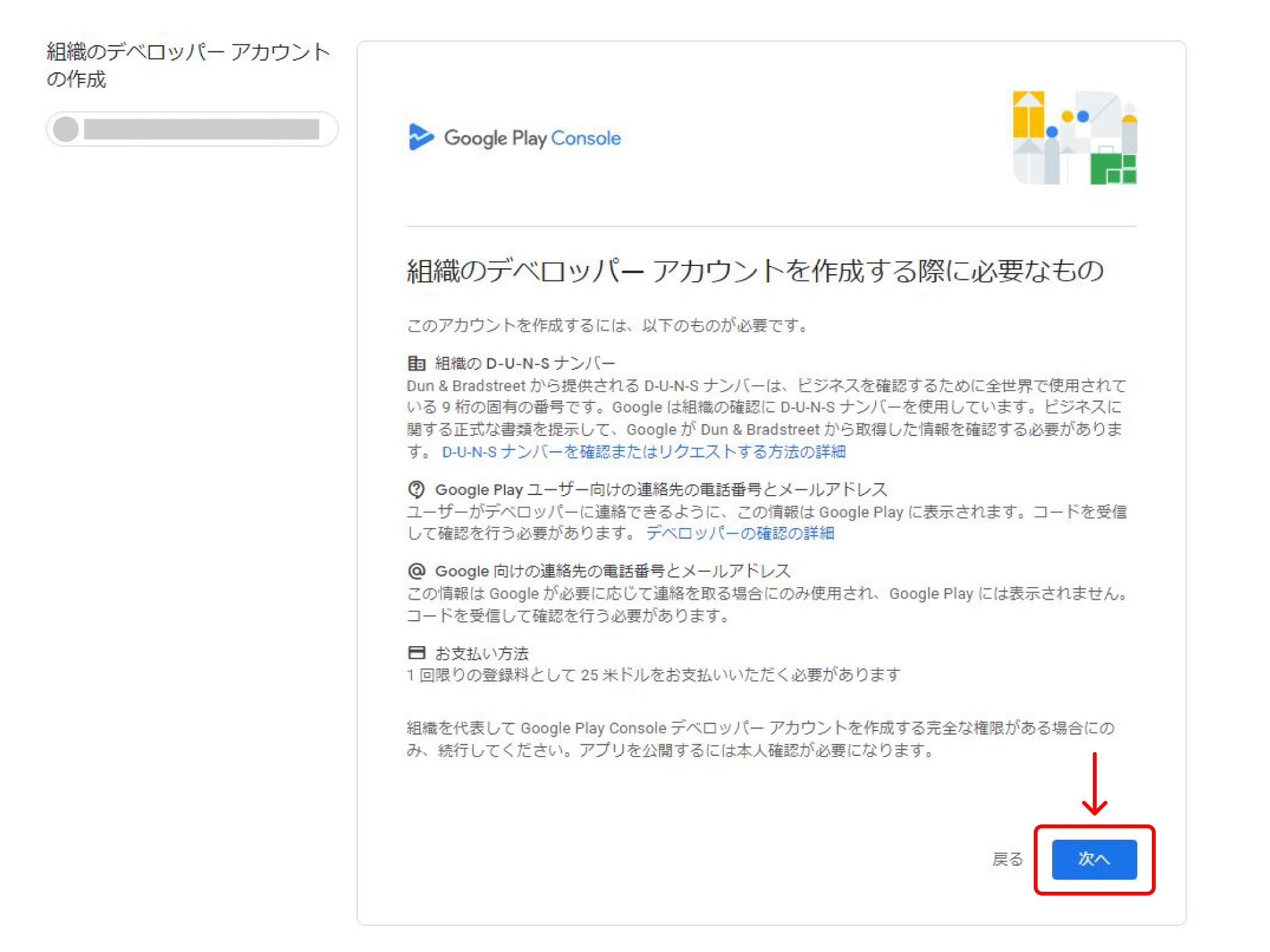 『組織のデベロッパーアカウントを作成する際に必要なもの』画面でアカウント作成に必要なものを確認し、【次へ】をクリックします。