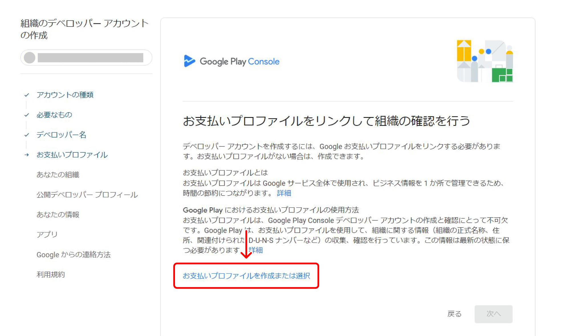 『お支払いプロファイルをリンクして組織の確認を行う』画面で【お支払いプロファイルを作成または選択】をクリックします。