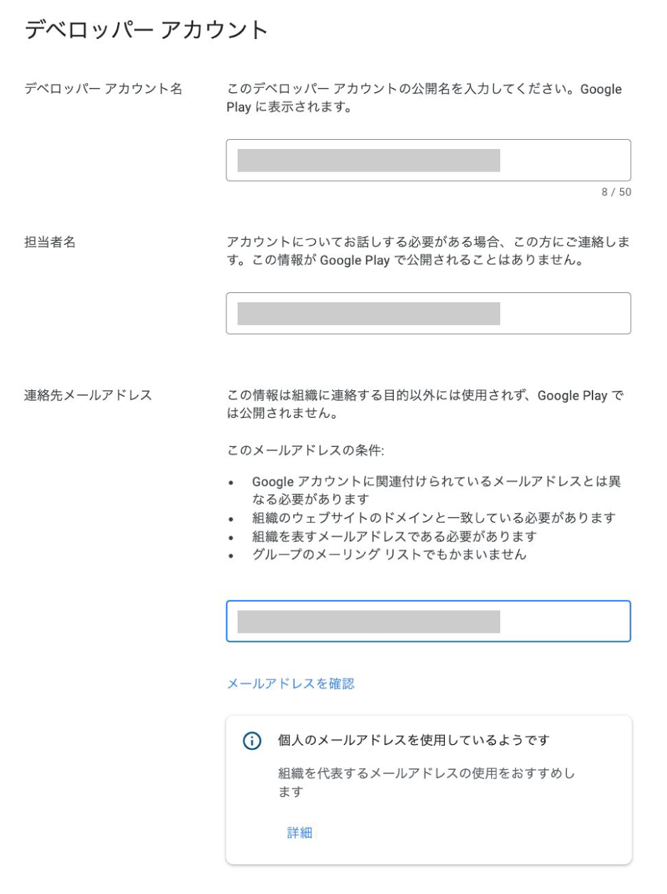 デベロッパーアカウント名 Gooogle Playに表示される公開名を入力します。 担当者名 担当者名を入力します。 ※ Google Playで公開される情報ではありません連絡先メールアドレス 担当者のメールアドレスを入力します。 ※ Google Playで公開される情報ではありません※ Googleのアカウントとは別のメールアドレスを入力してください入力が完了したら、『メールアドレスの確認』をクリックします。