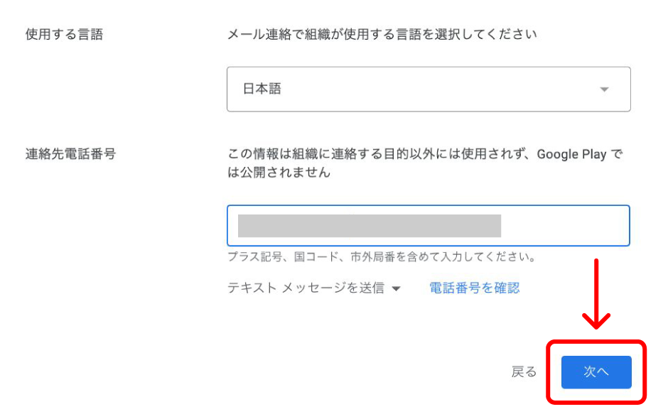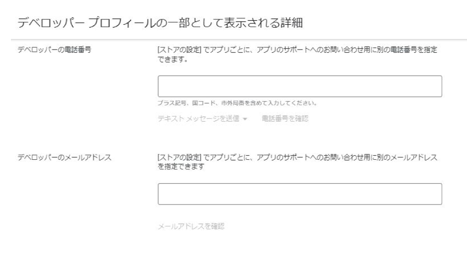 ※ Google Playストアで公開される連絡先の入力項目です※ アプリのご利用者様からお問い合わせが入っても問題のない連絡先を入力してくださいデベロッパーの電話番号 問い合わせ用の電話番号を入力します。(先頭の『0』を『+81』に変更して入力します) ※ 電話番号はGoogle Playに公開されます※ 03-1234-5678の場合『+81312345678』になります※ ハイフンは不要ですデベロッパーのメールアドレス 問い合わせ用のメールアドレスを入力します。 ※ メールアドレスはGoogle Playに公開されます入力が完了したら、それぞれの項目ごとに確認(『電話番号を確認』と『メールアドレスを確認』)をクリックします。入力した電話番号、メールアドレスに確認コードが届きますので、確認コードを入力し【確認】をクリックします。