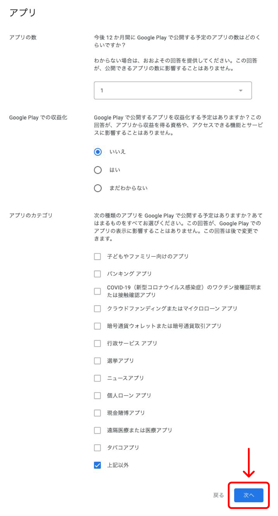 入力が完了したら【次へ】をクリックします。アプリの数 『1』で問題ありません。 Google playでの収益化 『いいえ』を選択してください。 アプリのカテゴリ 『上記以外』にチェックを入れてください。