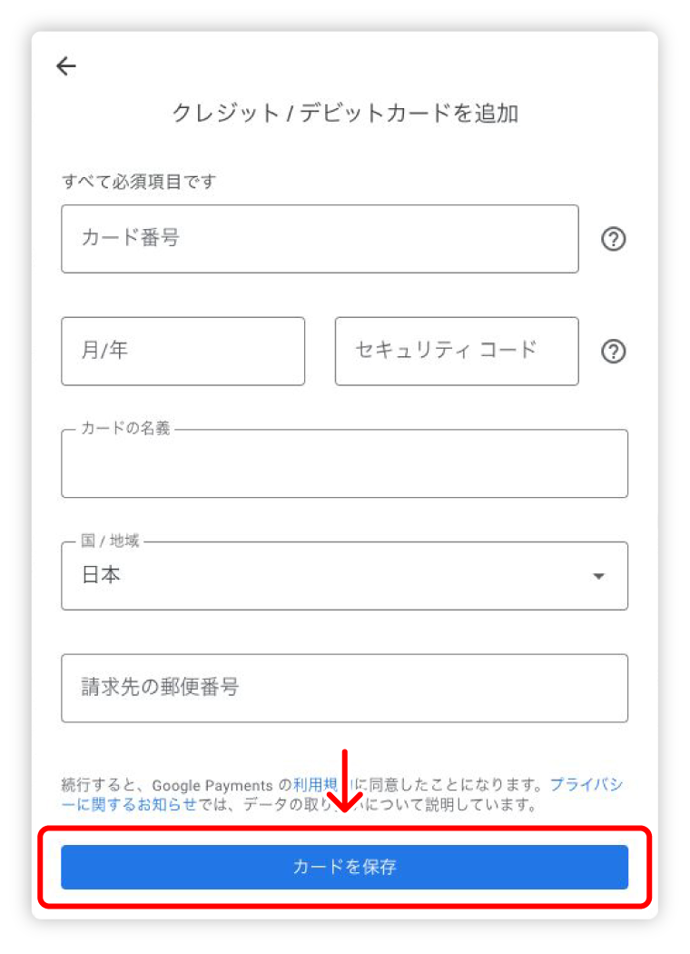 支払い方法を削除するGoogleアカウントに支払い方法が保存されますが、アカウント管理において支払いは『アカウント作成時の登録料のみ』のため、今後必要なければ削除して問題ありません。※ お支払いが発生するのは今回のみです