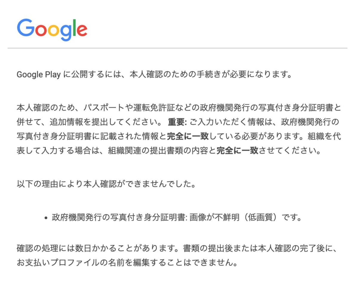 【提出した情報で本人確認が完了しなかった場合】Googleで本人確認ができなかった場合、その旨をお知らせするメールが届きます。