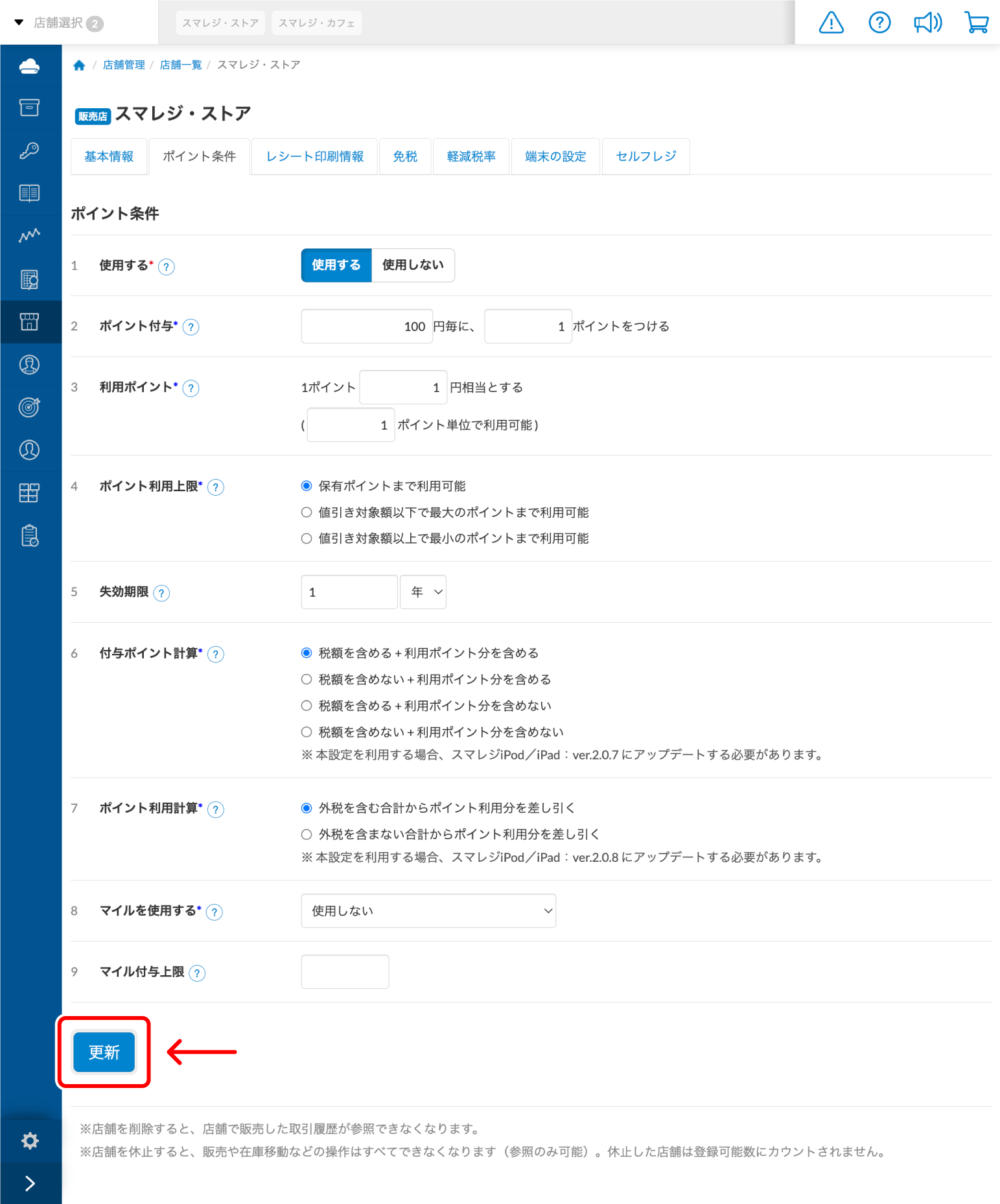 ポイント条件の各項目を設定し、画面下部の【更新】ボタンをクリックします。