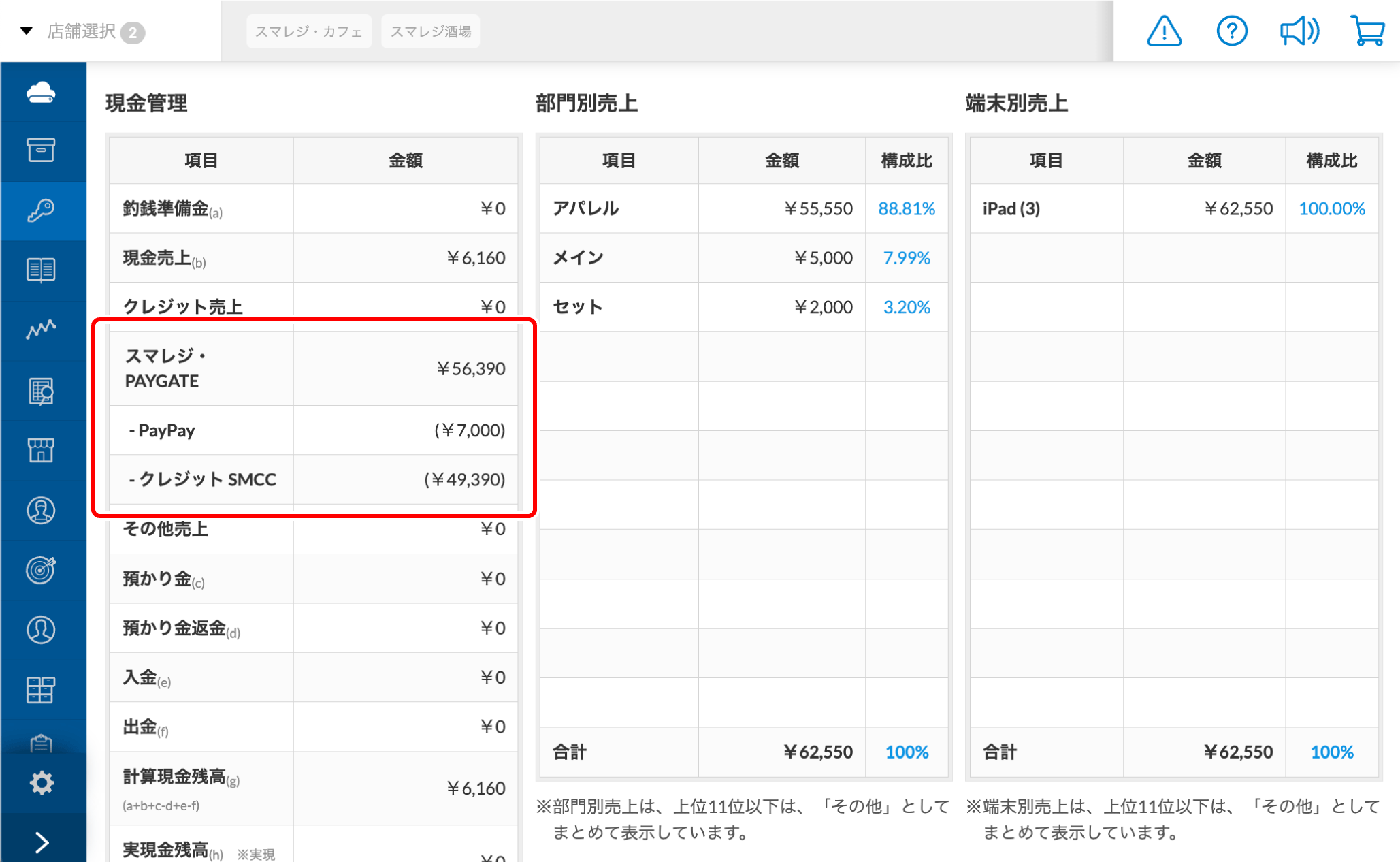 『現金管理』の項目に、PAYGATEの売上と、その明細が表示されます。