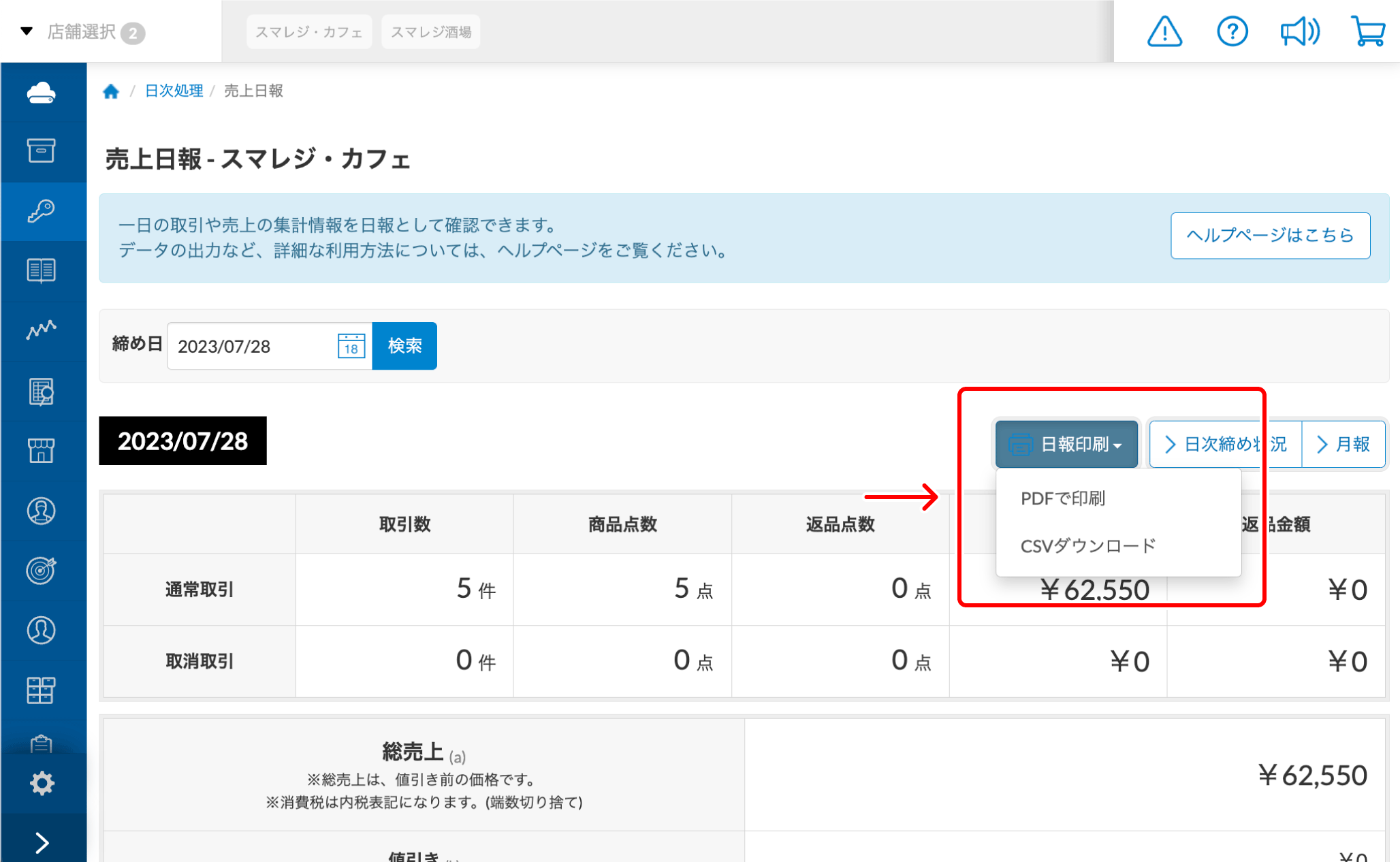 日ごとの売上を確認する場合は『日報』を、期間を指定する場合は『月報』をご利用ください。