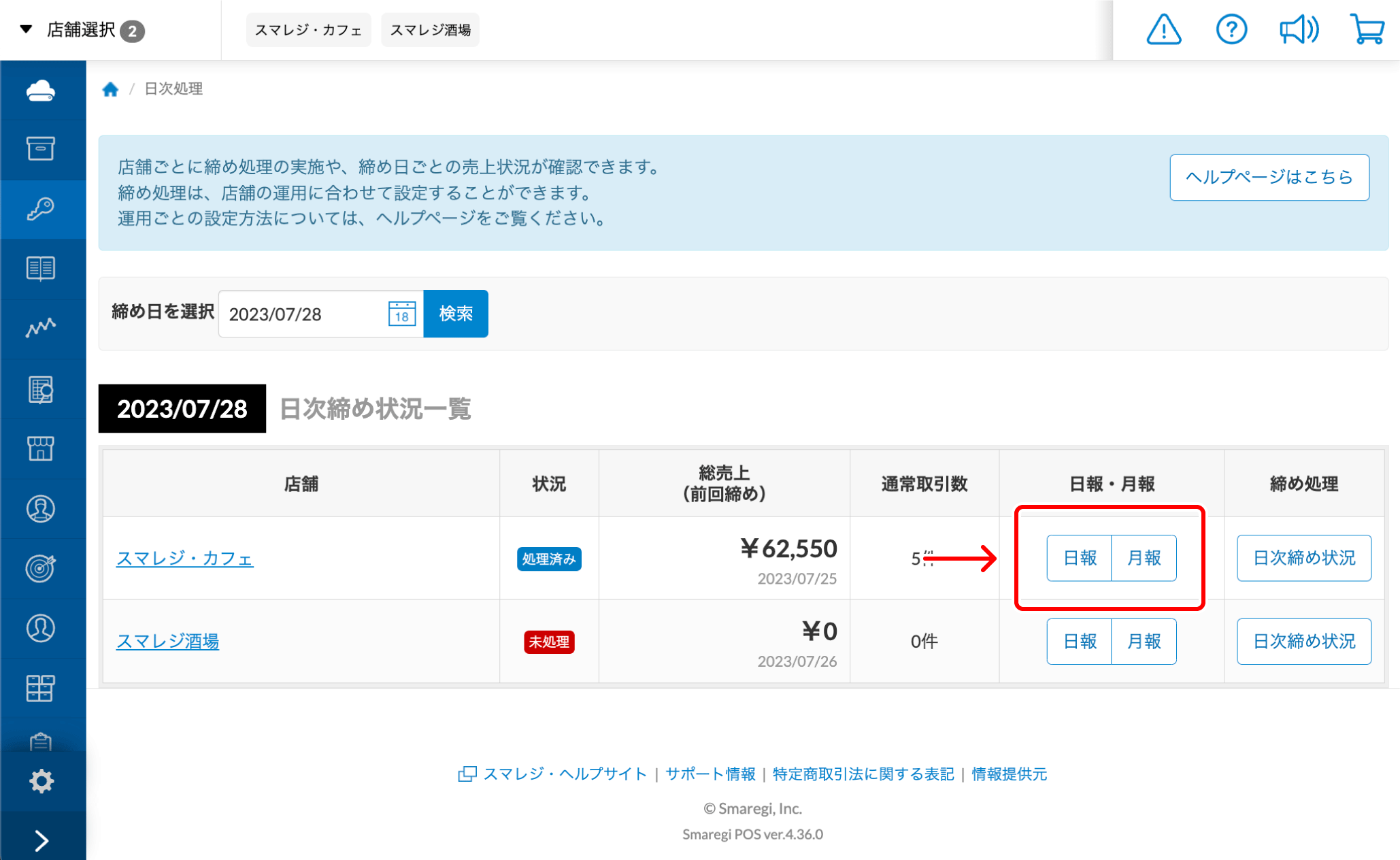閲覧したい店舗の、【日報】や【月報】をクリックします。 -